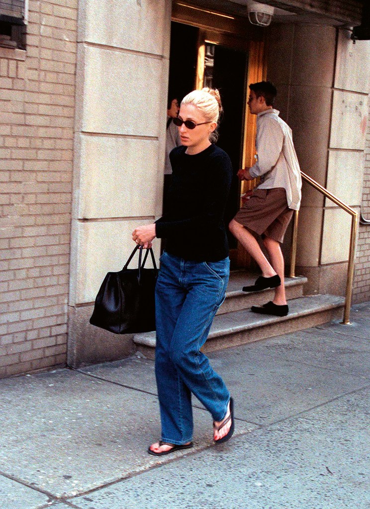 Known for favoring medium and dark denim rinses, Bessette Kennedy complemented her mainly neutral wardrobe whether she was in Manhattan or the Hamptons. Adding an L.L. Bean Boat and Tote enhanced her iconic look.