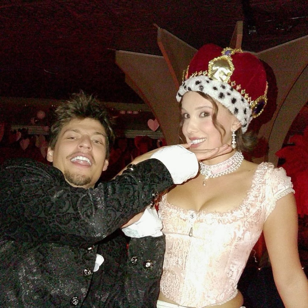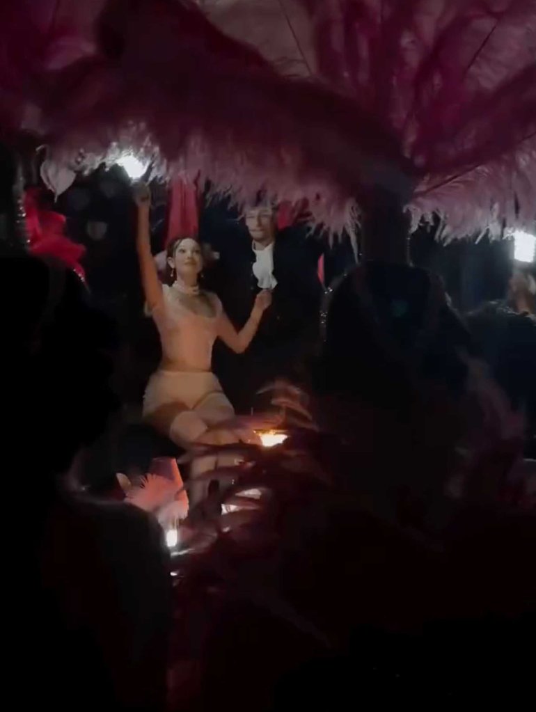 The "Stranger Things" alum wore a pale pink jacquard corset, ruffled bloomers, and thigh-high stockings, accessorized with pearls and a towering white wig. Her husband, Jake Bongiovi, attended in a dark jacquard jacket and frilled-collar shirt.
