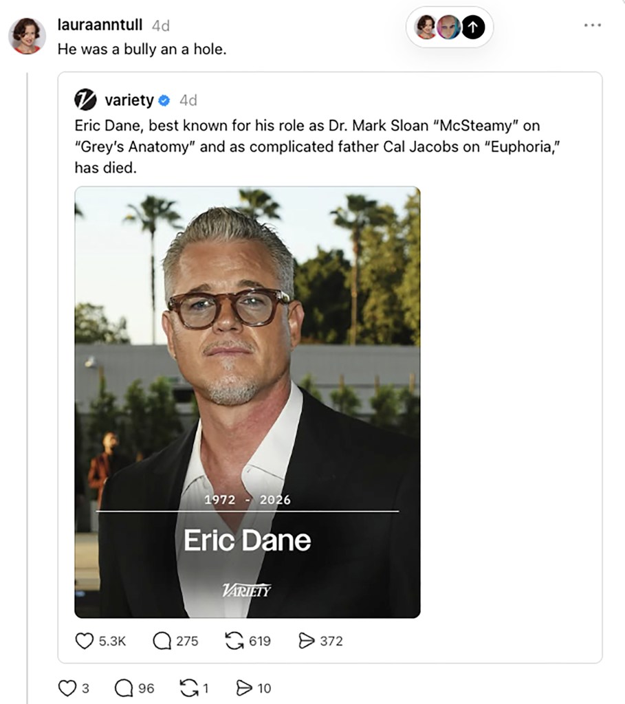 Laura Ann Tull, an extra on "Grey's Anatomy," accused the late Eric Dane of being abusive on set, sparking backlash from fans. Dane passed away recently after battling ALS.