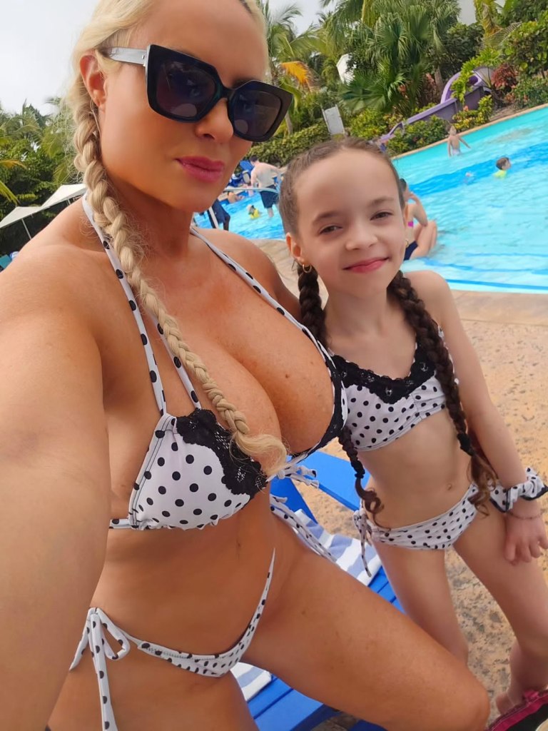 Austin wore a string bikini with black lace detailing, while her 9-year-old daughter donned a bralette-style top with similar lace details. Both sported matching braided pigtails for the beach outing.