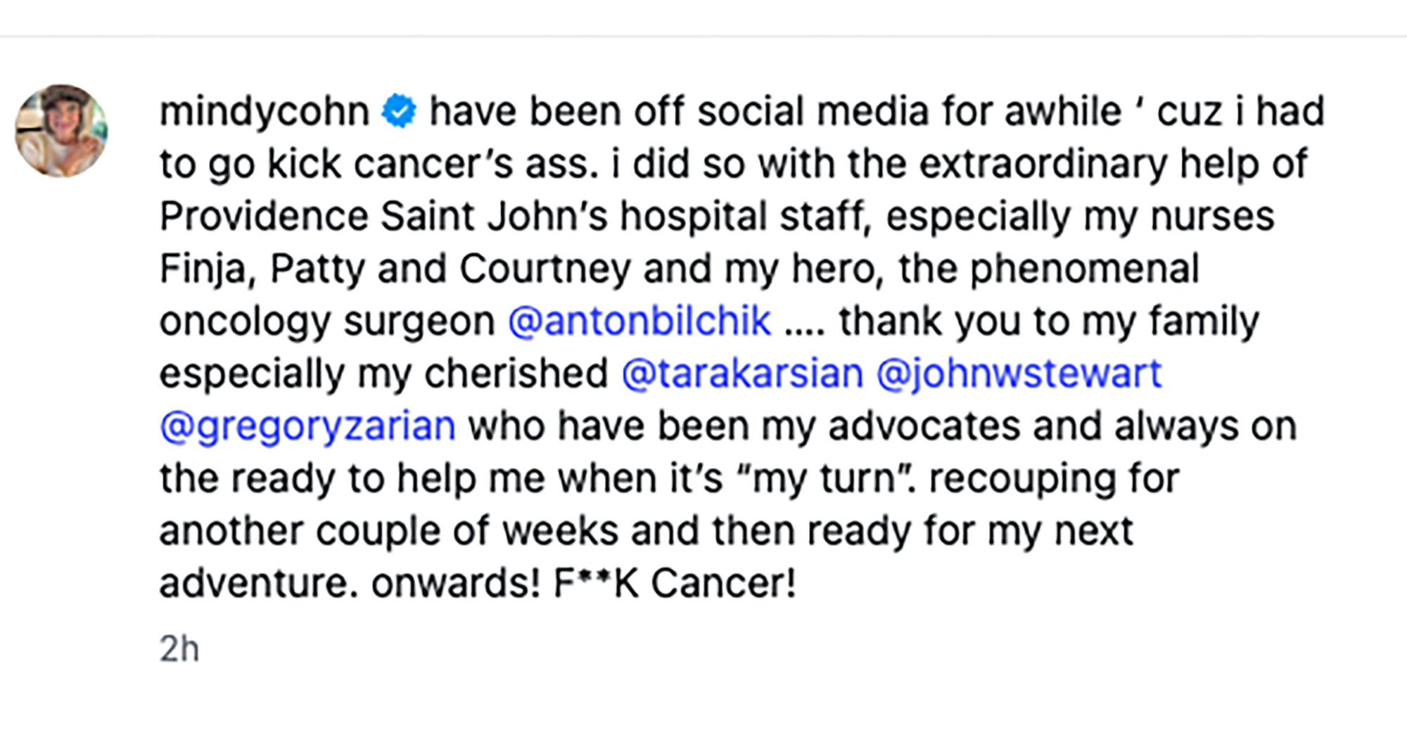 Cohn credited Providence Saint John’s hospital staff in Santa Monica, California, for their support during her treatment. She praised the nurses and oncology department specifically.