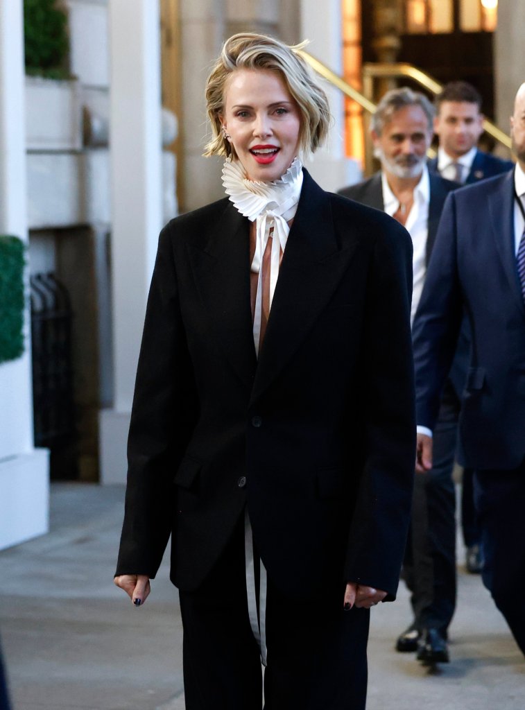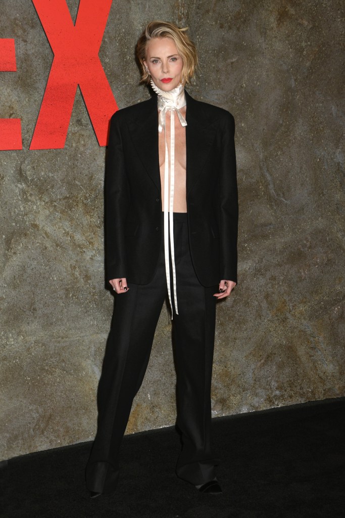 Charlize Theron attended the New York City premiere of "Apex" in a striking Dior Homme outfit. Her ensemble featured a tailored black suit with a high-fashion ruffled collar and an exposed midriff.